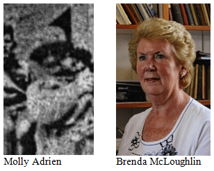 Brenda McLoughlin discusses the history of the Adrien family who are of Huguenot descent. Molly Adrien was born in 1873. Her father was Dr John Adrien and for a period the family lived near Stamullen, later moving to Balbriggan. John Adrien was Medical Officer at Balrothery Workhouse for thirty years. Brenda reads the names of the members of the board. She recalls Molly’s early life, explaining that she had four siblings and that many of her relatives were in the medical profession. The family was Roman Catholic. Molly’s parents died when the family was young, and the two youngest siblings, Brenda’s grandmother Eva and Edward, were made wards of court. Her grandmother told Brenda that Molly attended a Catholic boarding school in England and a French finishing school, as she herself also did. Eva became an artist and she later married Patrick Griffin. Brenda explains that he had previously wooed Molly and this was to affect the sisters’ relationship for ever after. Molly Adrien joined the Lusk branch of the Women’s Volunteer Movement which had been founded in 1914. Brenda did not know her, though her father remembered her well and described her as a very busy person, though eccentric. She had inherited a house in Oldtown from an aunt, and she cycled everywhere wearing a hat, with a green white and gold flag. Brenda remarks that the late Paddy Weston remembered Molly cycling around Lusk. Her home was used as a safe house which created a dangerous situation for her, and Brenda’s grandmother would worry about her sister’s safety because of this. Brenda discusses what she has learnt about her grandaunt from her researches, and explains that she was secretary of the Balrothery Old Age Pension committee. She recalls her memories of Molly’s house and says that she was apparently well-liked in the area and had many friends. Brenda reads from Molly’s sworn statement made on December 4th 1936. She had become a member of the Central Branch of Cumann na mBan in 1915 and was Thomas Ashe’s scout during Easter Week. She assisted Dr Richard Hayes in caring for the wounded following the battle of Ashbourne. The work carried out by her grandaunt in April 1916 and beyond is reflected upon, and Brenda remarks that all those women were brave, with only one cause in mind. During the War of Independence, Molly acted as a dispatch rider and scout, and Brenda calculates that she was in her late 30s while engaged in these activities. Though they inherited wealth from their parents, Molly and her siblings lived frugal lives. Brenda remembers her granduncle, Ned Adrien, whom she recalls as also being very eccentric. She well remembers her grandmother Eva who lived in her family home, and she recalls the fact that they were all interested in European history and were very well read on the subject. Brenda discusses Molly’s only romantic relationship, which failed when the man in question fell in love with her sister Eva with whom he eloped. Eva Adrien and Patrick Griffin went on to live a happy life and they reared seven children. Molly broke all connection with her sister, and another sister, Katy, would tell Eva about Molly’s life thereafter. Brenda’s great- grandmother, Mary McCullagh is recalled. Dr John Adrien had retired from the board of the Balrothery Workhouse in 1879 due to ill-health, and his daughter Molly was appointed chairman of the board after the Rising. Brenda recalls the Workhouse and describes the work undertaken there. Molly Adrien supported the republican side during the War of Independence. She lived in Oldtown all her life, and she died in 1949 and was buried at Crickstown Cemetery with military honours. The house, which is now demolished, was always a safe house but no relevant names are mentioned in Molly’s statement. Brenda remembers the railings at the house and remarks that apparently during Molly’s lifetime they were painted green white and gold. A plaque was erected in her memory on the bridge in Oldtown in the 1970s or 1980s. The present Bracken Hotel in Balbriggan was the Adrien family home when they first arrived in the area. Brenda has letters and receipts connected with the Adrien men’s education at Ampleforth College in England. Dr John Adrien attended the School of Medicine at the Catholic University of Ireland. She remembers what her grandmother Eva would say about her estranged sister Molly, whom she always described as being eccentric and foolish though Brenda recalls Eva as being rather eccentric herself. She never showed any interest in politics. Brenda’s father would recall his mother’s worries about Molly’s house and the people who took refuge there. Molly died in 1949 when Brenda was two years old, and the oration at the graveside at Crickstown Cemetery was delivered by P.J. Burke TD. No record of her activities in 1916 or its aftermath may be seen on her headstone. Her brother Ned Adrien is also buried there. Brenda reflects on the lack of information in the family about her grand-aunt, and explains that they are now learning about her extraordinary activities.