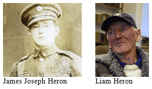 James Joseph Heron was born in Carlow town and when he was four years old the family moved to the North Strand in Dublin. Liam Heron knows very little about his father’s early life, though James’s first cousin, champion diver Eddie Heron, used to visit the family home and Liam picked up information from him. James and Eddie had been imprisoned together at Ballykinlar Internment Camp in Donegal. James ‘Jimmy’ Heron joined the Irish Volunteers in 1914, and for three weeks prior to Easter Week 1916 he was training with the 1st Battalion ‘F’ Company in Dublin. On Easter Monday he was at the races in Fairyhouse, and Liam remarks that he remembers seeing in the house the stub of the train ticket used on that trip. On his return from the races Jimmy discovered that the Rising had begun, and he proceeded to the GPO where he was given a shotgun and was to spend the night. He was then sent to the Imperial Hotel with Frank Thornton. Liam knows that Jimmy was one of the younger men involved, as he was only 18 years old at that time. His group stayed at the Imperial Hotel (the site of Clerys department store) until the Friday of that week, when the building went up in flames. The men, under the command of William Brennan-Whitmore, escaped as far as Cumberland Street, and among them was Noel Lemass who was injured on capture. Liam explains that his father spoke very little about these events. He knows that somebody informed the police of the men’s location in a basement in Cumberland Street prior to their capture. Jimmy Heron was taken to Richmond Barracks and later transferred to Frongoch. On his release in August 1916 he did not rejoin the Volunteers. His mother was now a widow and was infirm, and his sister Molly was on Michael Collins’s staff, acting as a secretary. Other family members were a younger brother, Jack, and two sisters, Freddy and Maddy. Liam remembers Molly as a jolly person who was quite religious. She and her sister Maddy worked in Kennedys, the bakers. Jimmy was arrested on a tram in 1920 and imprisoned at Ballykinlar, though Liam does not know the reason for his arrest. He favoured Fine Gael though he took no active part in politics. Liam recounts an anecdote told to him by Liam Cosgrave. Liam’s brother Jim, who was a Captain in the Army, has their father’s medals. At one time, Liam would wear the medals at the annual commemorative Mass in Fingal. Jimmy Heron was a member of the LDF during the Emergency. Liam explains that he is the oldest of ten children, and that butchering was the family occupation. His mother’s surname was Howard and her family was from Swords. As far as Liam is aware, Jimmy did not keep in touch much with his 1916 comrades. His group was from the city centre and not from Fingal where Jimmy lived, so not many opportunities arose for meetings. Liam describes some photographs of his father, and his uniform, and he explains that he discovered much of the detail of his father’s history from his application for the Old IRA Pension. When he was younger Liam had no interest in history and did not ask his father any questions about his past. Now that he is older he is trying to find out more and would like his father to take his place in history. He remembers that Jimmy had a bone carving featuring a harp and a wolfhound, and feels that this may have been fashioned in Ballykinlar. Jimmy Heron is buried in Swords. Liam quotes a few lines of poetry that he has had engraved to his parents’ headstone [from ‘The Glories of Our Blood and State’, a poem by James Shirley.] Jimmy Heron was a member of the Old IRA Commemoration Society for many years. His son explains that a firing party was present at his funeral, a bugler played The Last Post and the Tricolour was draped over the coffin.